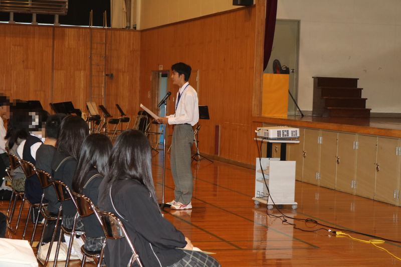 校長講話では,まず夏季休業中の本校生徒の部活動等の取り組みに触れ,時間は平等に与えられているので,意欲的に時間を使うことの大切さを述べられました。次に田嶋幸三著『「言語技術」が日本のサッカーを変える 』という本の紹介があり,刻々と変化するサッカーにおけるプレーと同様に,高校生の探究的な学びや総合型選抜等においても自らの意図を言葉にすることが必要とのことでした。