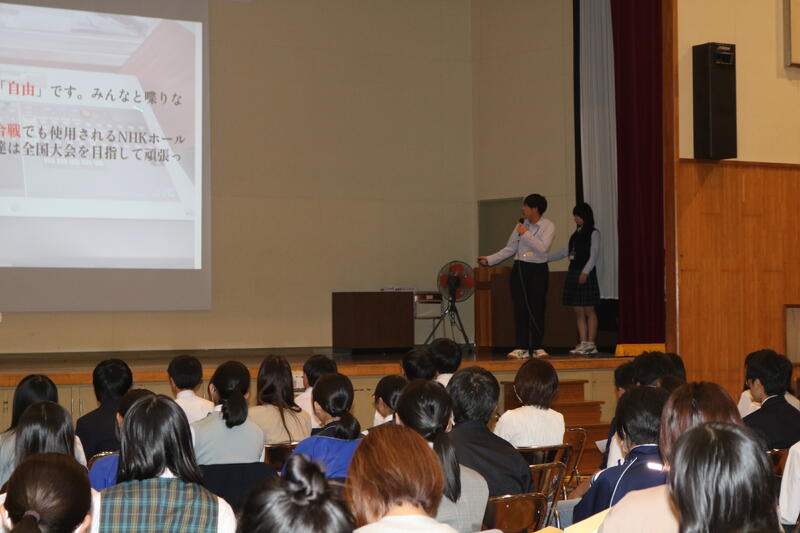 なお,集会の始めに全国壮行会を行いました。インターハイは本校生徒が陸上女子砲丸投・円盤投,ローイング(ボート),少林寺拳法の各競技に,全国高等学校ダンスドリル選手権大会は本校ダンス部が出場します。インターハイの競技については,「インハイTV」というサイトでライブ配信があります。
