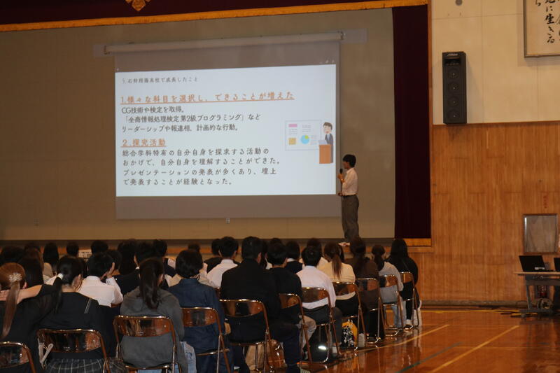 また、5,6校時は「2年次スポーツ概論」の授業において、本校と連携協定(高大連携事業)を結んでいる北翔大学の方が来校され、出張講義をしていただきました。内容は、「ハイパフォーマンスを生み出すスポーツ心理学」と題し、前半は「スポーツとは」、「緊張とは」といった内容で講義をいただき、後半は「ジョハリの窓を活用した自己分析実習」、「大学とは」といった内容で実習・講義をしていただきました。