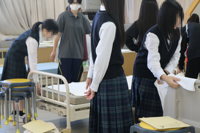 ↑体験授業(看護福祉科・ベッドメイキングに挑戦!)