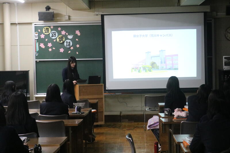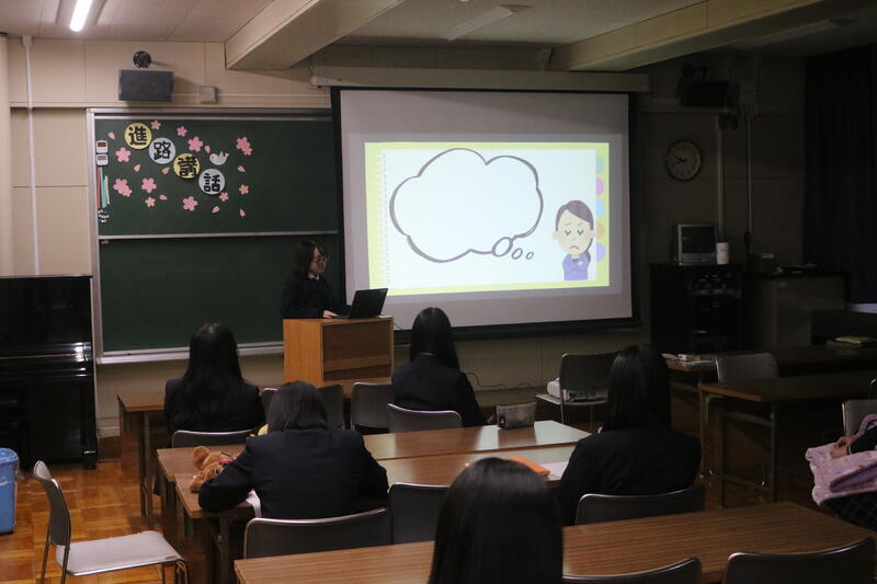 2月12日(木)1、2時間目の選択科目「保育実践Ⅰ」で「進路講話」を実施しました。保育実践Ⅱを履修し、保育関係の進学を決めた先輩が来校し、自身の進路活動を後輩に伝えてくれました。授業や部活動での頑張り、検定やボランティア活動で得た知識や経験、課題研究の取り組みの大切さなど、自身の進路活動に役立ったことをスライドを使いわかりやすく後輩に話しました。2年次生は、真剣にメモを取りながら先輩の話に耳を傾け、たくさんの質問をし、充実した2時間となりました。以下、生徒の感想です。