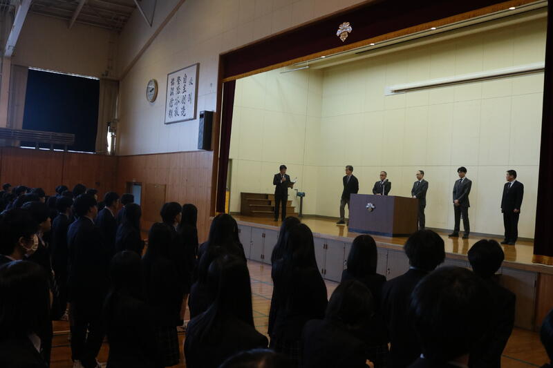 校長講話では、19年ぶりの国体入賞を含む部活動や、地域の課題に向き合った課題研究の成果がまず取り上げられました。また,ノーベル賞受賞者の言葉「1つ1つ」や「無用の用」を引用し、専門外の学びが自己を深めると説き、総合学科での多様な探究を促しました。3年生には進路への準備と粘り強さを求め、全校生徒に冬休みは生活習慣を守り、事故に注意して1月16日に元気に登校するよう呼びかけました。
