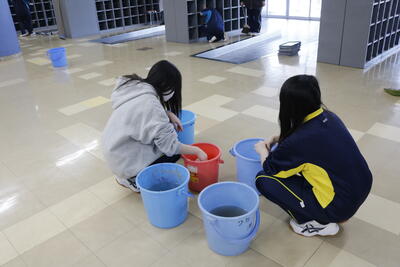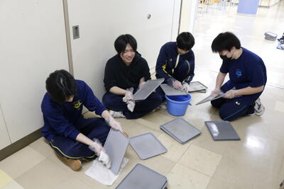 この日の活動を予定していた部活動の生徒の手で、全校生徒分の下足箱をきれいにしました。トレーを取り出し、棚から砂を掃き出し、雑巾で拭き、トレーもきれいに拭き上げました。おかげさまで、下足箱から相当量の砂が出てきました。協力してくださった部活動生徒のみなさん、ありがとうございました。
