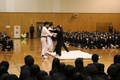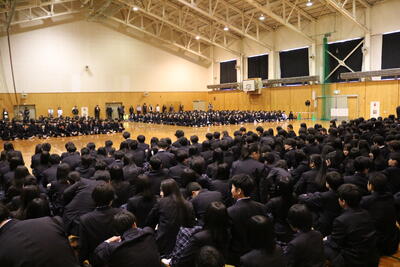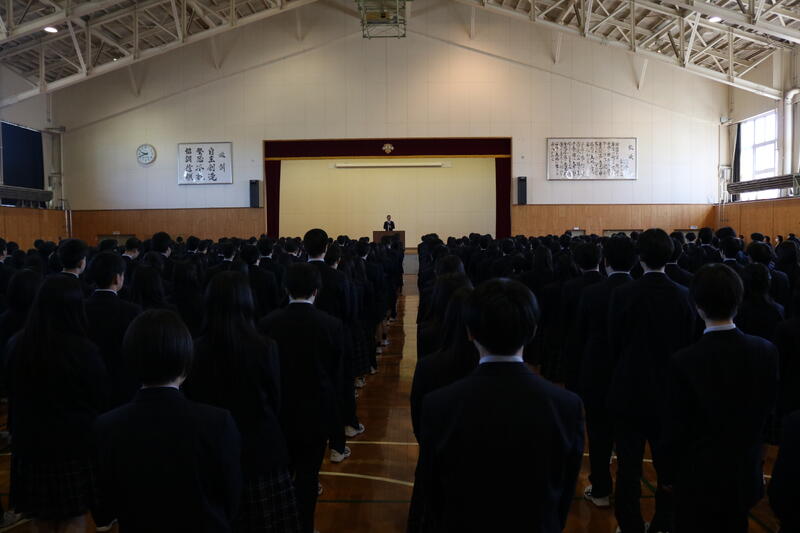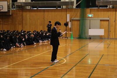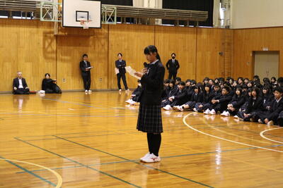校長先生からは新年の挨拶と共に、メジャーリーガーのダルビッシュ有選手の言葉「練習は嘘をつかないといわれるが、考えてやらないと嘘をつく」が紹介され、ただ漫然と努力するのではなく「考えて努力すること」の重要性が説かれました。次に生徒指導部長から、地域住民へのマナー遵守や不審者への警戒といった生活指導上の注意が伝えられました。最後に第40回"北方領土を考える"高校生弁論大会に出場する生徒による壮行発表が行われ、現地の歴史調査や返還への願い、そしてロシアとの共生に向けた決意が述べられました。