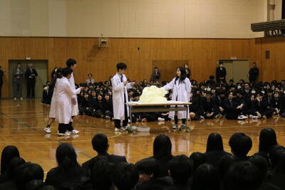 また,12月19日(金)に校内で行われた3年次の課題研究発表大会の結果発表と表彰も行われました。最優秀賞「起業」,2位「髪の毛がサラサラになる条件」,3位「太らないラーメン」,オーディエンス賞「運動と遊びの大切さ」でした。