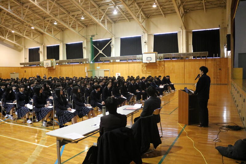校長先生からは新年の挨拶と共に、メジャーリーガーのダルビッシュ有選手の言葉「練習は嘘をつかないといわれるが、考えてやらないと嘘をつく」が紹介され、ただ漫然と努力するのではなく「考えて努力すること」の重要性が説かれました。次に生徒指導部長から、地域住民へのマナー遵守や不審者への警戒といった生活指導上の注意が伝えられました。最後に第40回"北方領土を考える"高校生弁論大会に出場する生徒による壮行発表が行われ、現地の歴史調査や返還への願い、そしてロシアとの共生に向けた決意が述べられました。