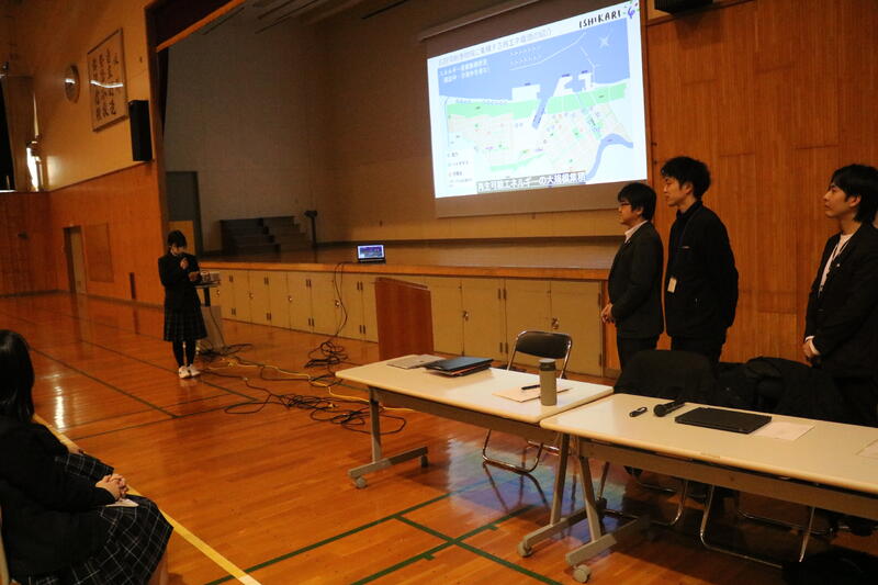 8チームの発表者(9名)が3年次生徒の課題研究での探究より選抜され、審査員長の渋谷 一典 様(北海道教育大学教育学研究科教授)、鈴木 肇 様(北海道教育庁石狩教育局教育支援課学校教育指導班主査)、宮崎 嵩大 様(石狩市企業連携推進課主任)、吉村 教賢(本校校長)、中谷 実孝(本校教務部長)、来賓の方々、保護者様、全校生徒の前で堂々とした発表を行いました。