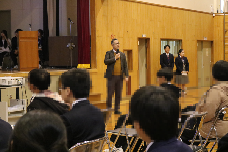 東日本大震災後の二本松市と南相馬市での支援活動を中心に,助かった人はどのように生活し生きていくのか,支援者には何が必要とされ何ができるのかを,事実と経験をもとに多くの現場写真を使って丁寧に説明していただきました。また,「震災遺構を見たことがありますか?」という工藤さんの質問に対して誰も手を上げることができ無かった状況は,会場の多くの者がはっとさせられたのではないでしょうか。最後に,標高4mしかない本校で津波からどう逃れ(自助),震災後は地域で何ができるか(互助・共助)という重要な課題を提示していただき,ご講演を締めくくられました。
