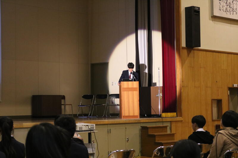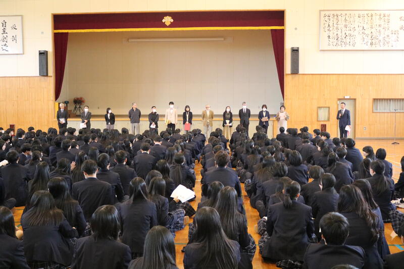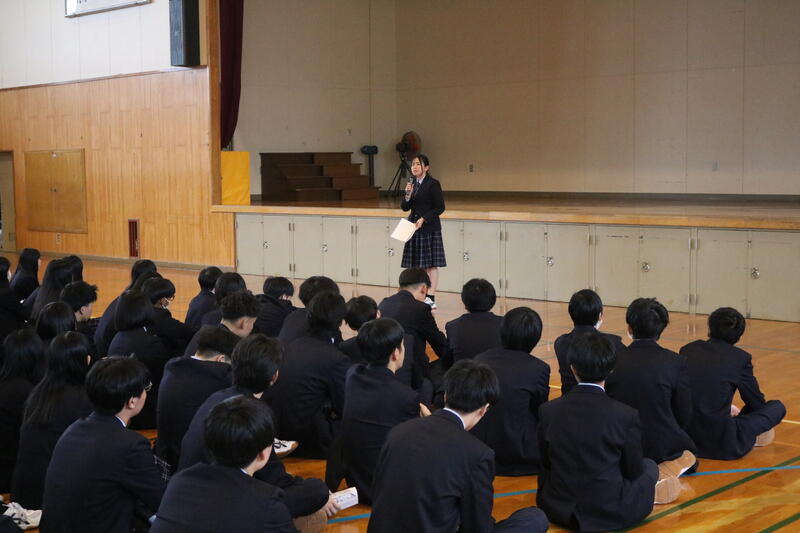 また,集会に先立ち次の表彰伝達がありました。福祉系3名のチーム(3年次2名と2年次1名)が第10回北海道地区高校生介護技術コンテスト優秀賞(全国高校生介護技術コンテスト出場)。料理部3年次3名がとかちマルシェ料理甲子園2025審査員特別賞。美術工芸部が,高文連札幌地区美術大会で平面の部入選2年次1名,立体の部入選2年次1名,平面の部佳作3名(3年次1名,2年次1名,1年次1名)(5名全道大会進出),第4回BUNKAファッションデザイン画コンクールリトルファクトリー賞2年次1名,入選3名(2年次2名,1年次1名)。陸上競技部2年次男子生徒1名が札幌地区新人戦男子砲丸投げ決勝4位(全道新人戦出場)。ボート部が,国民スポーツ大会予選で男子シングルスカル優勝3年次1名,女子シングルスカル優勝3年次1名,男子舵手付きクォドルプル道選抜メンバー入り2年次2名,女子舵手付きクォドルプル道選抜メンバー入り3年次1名(5名国民スポーツ大会出場),全道新人戦で男子シングルスカル第3位2年次1名,女子シングルスカル第1位1年次1名,男子ダブルスカル第1位1年次2名,同第3位1年次2名,女子ダブルスカル第2位1年次2名,男子舵手付クォドルプル第1位2年次5名(1位8名全国高等学校選抜ローイング大会出場)。