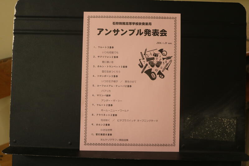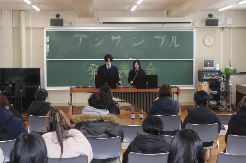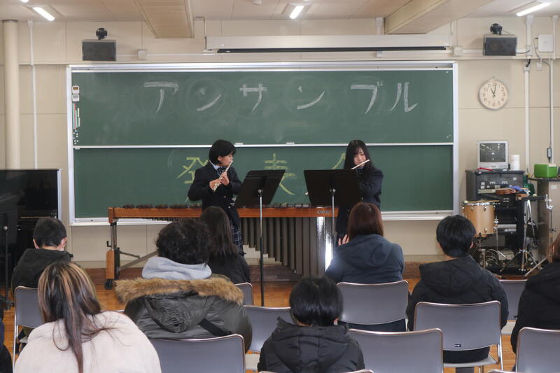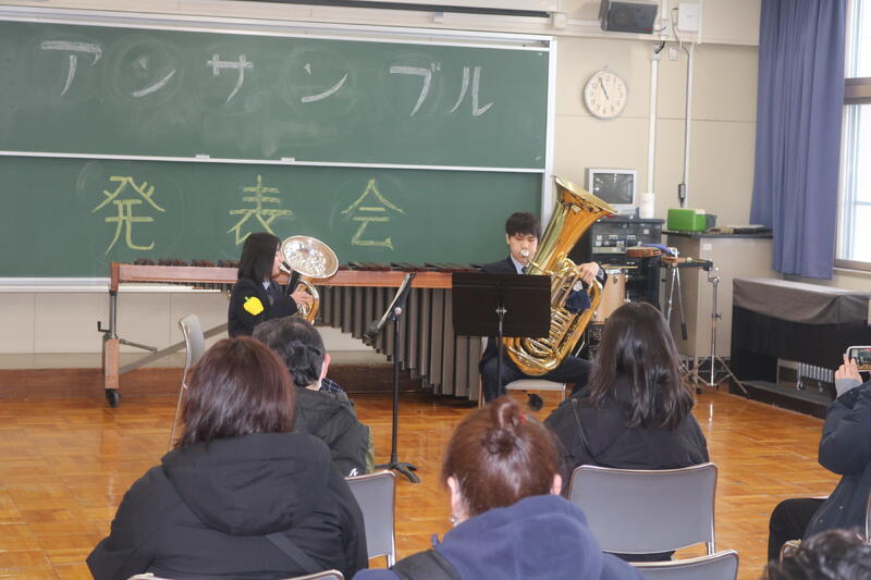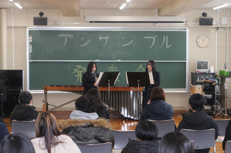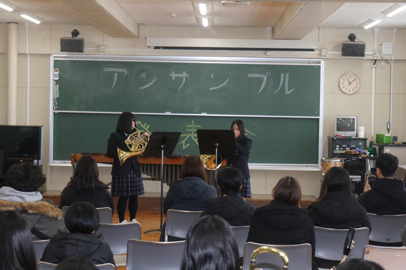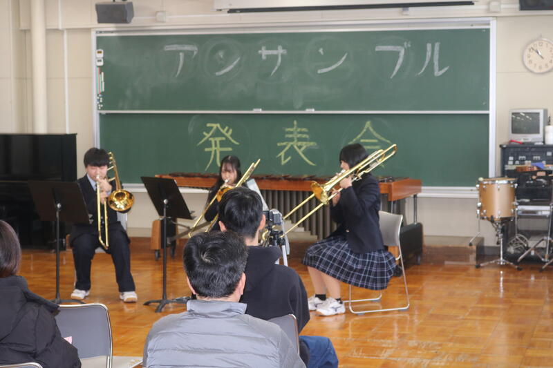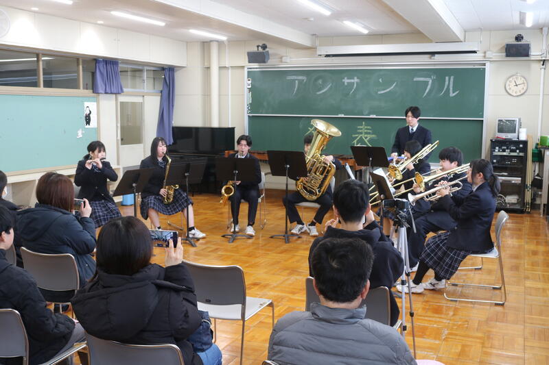 1月25日(日)吹奏楽局による「アンサンブル発表会」が開催されました。この発表会はアンサンブル力の向上を目指し、冬期間の課題として取り組んできた成果を保護者の皆さんの前で発表するというものです。同じパートを中心に編成した10チームが、ジブリやディズニーなど聴き馴染みのある曲を披露しました。この日は悪天候でしたが、ご来校いただいた保護者の皆様から大きな拍手をいただくことができました。今回の経験を今後の活動に生かし、更なるレベルアップを図れるよう頑張っていきますので、応援よろしくお願いいたします。