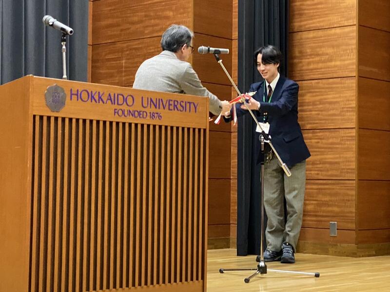 課題研究の授業の中で取り組んだ、学校内におけるモバイルバッテリーレンタルサービルというビジネスプランをテーマに、ポスターセッションやYouTubeでのスライド発表行い、見事、「北海道大学賞」を受賞し表彰されました。