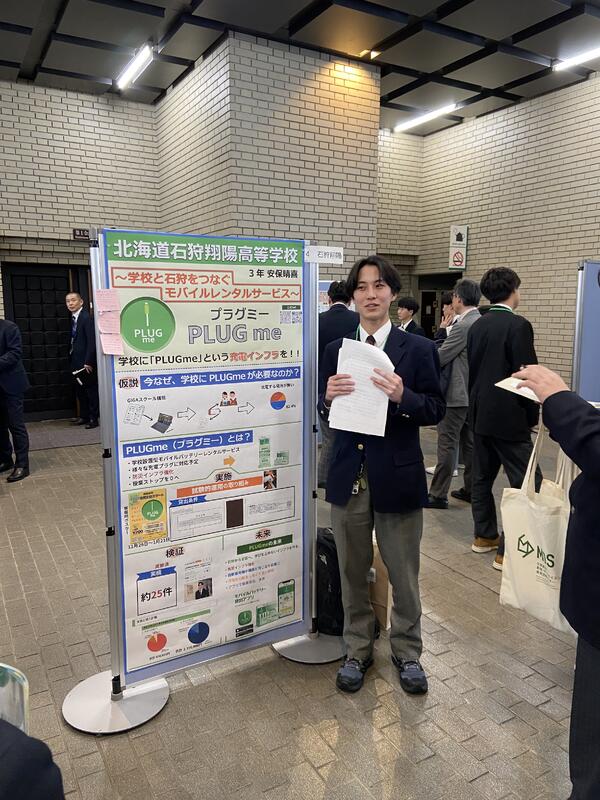 安保くんは課題研究の時間において「起業」と題し、まだどの学校でも行われていない学校におけるモバイルバッテリーの貸し出しというビジネスプランを提唱しました。ここに来るまでに、株式会社ツキモクの中橋様(代表取締役社長)や石狩市役所の職員の皆様にプレゼンをしたり、校内での実証実験を行うために事務長に交渉したり、売店職員に打診したりするなどし、現在では実際に本校売店で貸し出しの社会実験を行っています。